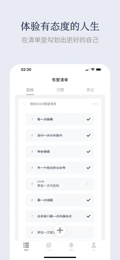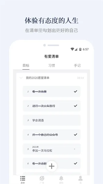 有爱清单app能帮你轻松处理目标管理相关问题。它可以帮你发现目标、愿望和梦想,并记录实现历程。比如你想养成早起的习惯,就能在这记录下来,每天完成后打卡,超顺滑快捷。还能充当记事本,随时随地自由编辑添加新记事。