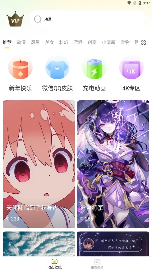 拥有丰富多样的壁纸资源,涵盖动漫、风景、游戏等各类主题,不管是人物明星、宠物植物还是自然风光,一网打尽,各种壁纸主题应有尽有,满足不同用户的个性化需求。