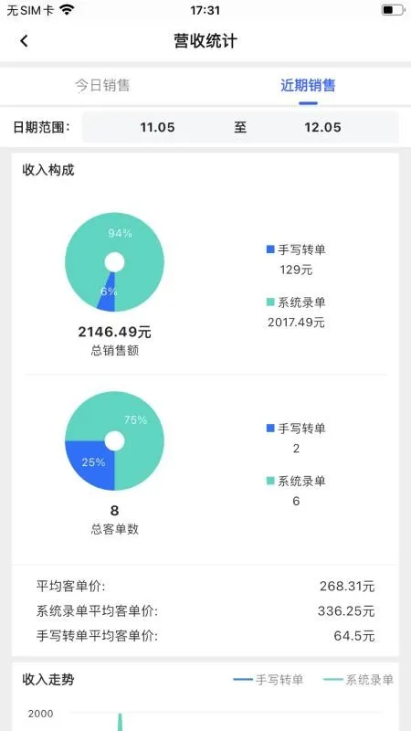 3、AI开单的营收统计清晰直观。以可视化图表展示各项营收数据,便于用户随时掌握营收情况。