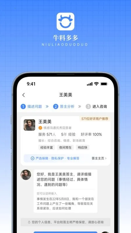牛料多多app是综合咨询服务平台,涵盖情感、家电、职场等多领域。入驻海量优质答主,有在线咨询、搜索等功能,特色是综合咨询、专业答主,能帮用户省心高效解决问题。