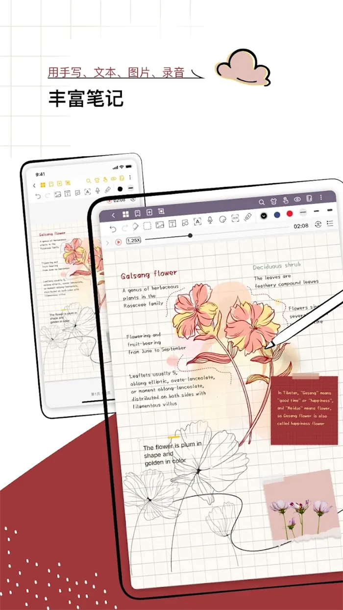 2. **笔记形式多样**:提供丰富多样的笔记本封面和纸张模板,比如康奈尔笔记等,满足不同笔记需求与个性化要求。有笔划编辑、自动图形绘制、文本框、图片插入等功能,还补充了同步录音功能,可制作声图文并茂的多媒体笔记。