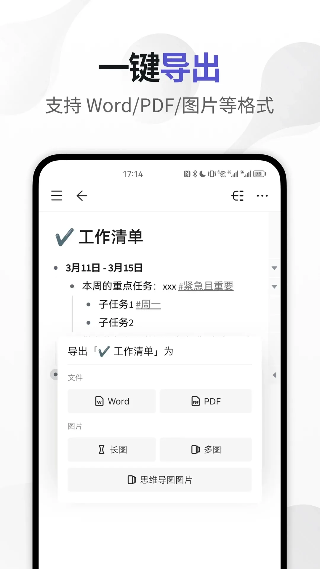 3、功能丰富:具备云端网盘保存重要文件,支持多种格式文件的导入导出,可将思维导图以图片形式导出,还能添加子图、自由改变图片样式等,并且新版本思维导图模式加入挖空功能和锁定视图防误触。