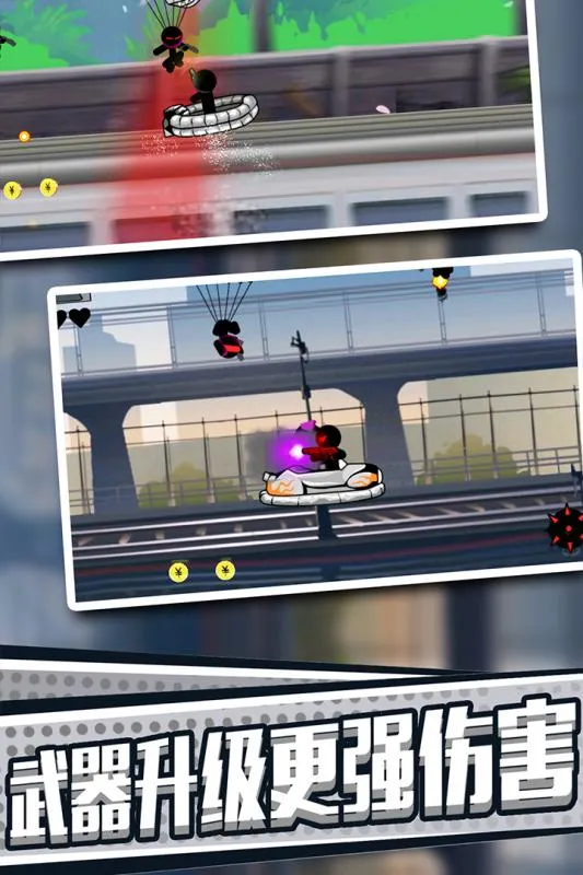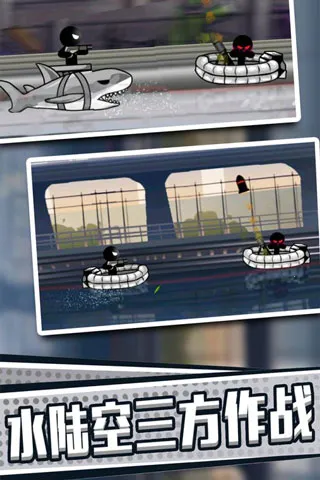 1. 水陆空三方作战机制:敌人从地面、空中、水域同步发起追击,带来立体压迫感,玩家需兼顾多方向防御与反击,击杀过程成就感十足,场景代入感显著提升。