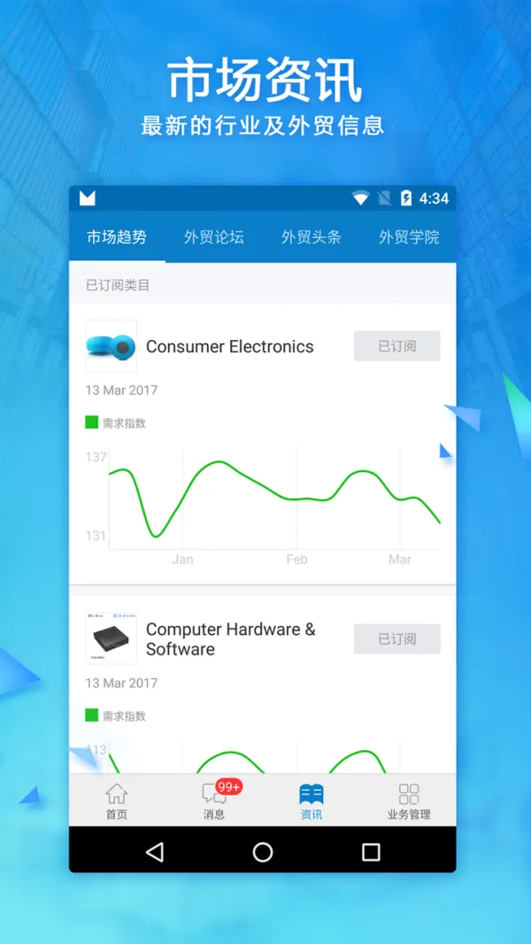 2. 拥有全面的信息获取渠道,涵盖市场趋势、外贸头条等快速反应的行业数据和资讯,还有培训课程、外贸圈论坛等,助商家掌握行业动态、汲取经验。