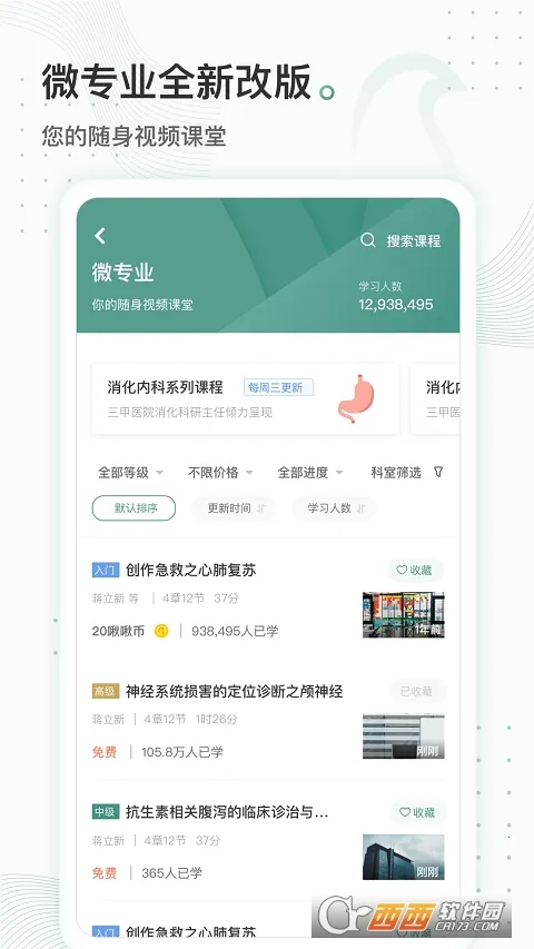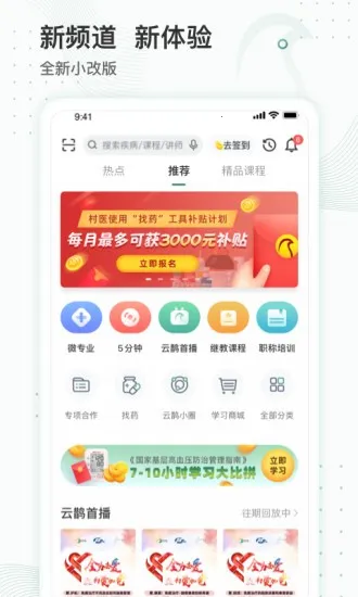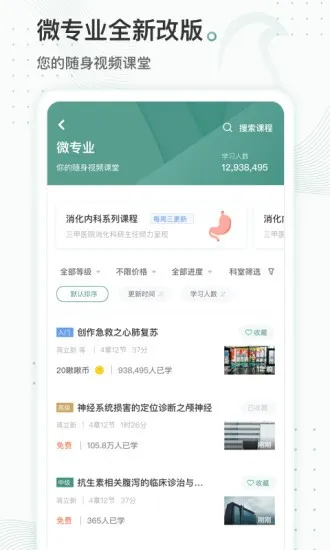 云鹊医涵盖入门到高级的微专业课程,联合国家心血管病中心开发高血压、糖尿病等慢病管理课程,五分钟医学院以音频图文形式解析常见病,利用碎片时间强化知识点。