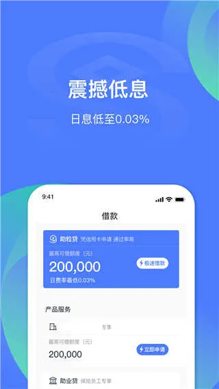 民生易贷是一款专注普惠金融服务的移动信贷工具。它借款条件宽松,凭身份证即可在线授信,额度最高20万元。操作超便捷,全程线上化,仅需3步就能完成借款申请,最快10分钟资金直达银行卡。日息低至0.03,无额外手续费,支持随借随还,期限与额度灵活,适配不同短期资金需求。新用户还有双重福利,最高888元返息和限量10000个现金红包。息费结构清晰透明,无隐藏收费。平台安全可靠,遵循金融监管要求,采用银行级安全体系,资金全额第三方存管。覆盖培训分期、车险分期、日常消费分期等多元生活场景,让你在衣食住行学医购各环节都能轻松获得资金支持,解决资金难题,享受便捷金融服务。