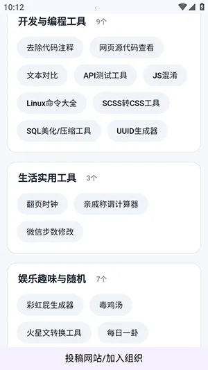 网页工具聚合是一款超棒的综合工具软件。它能解决日常生活、学习、办公中的各种琐碎难题,提升效率。打开软件就能看到全部功能列表,每个板块都有多种实用工具。比如生活常用小工具,计算器、日历、单位换算等一键轻松处理日常琐事;文件管理、格式转换等系统功能,帮你优化手机使用;还有图片裁剪、压缩、去水印等编辑功能。它免费无广告,所有工具按需自由选择一键开启,无需繁琐设置,上手即用。涵盖全品类工具,一款软件能替代多个小众工具。而且还持续更新,界面简洁,分类明确。不管是查询百科、翻译,还是提取文字、处理文件,它都能快速搞定,让你处理事务更快捷省心,一站式满足各类需求。
