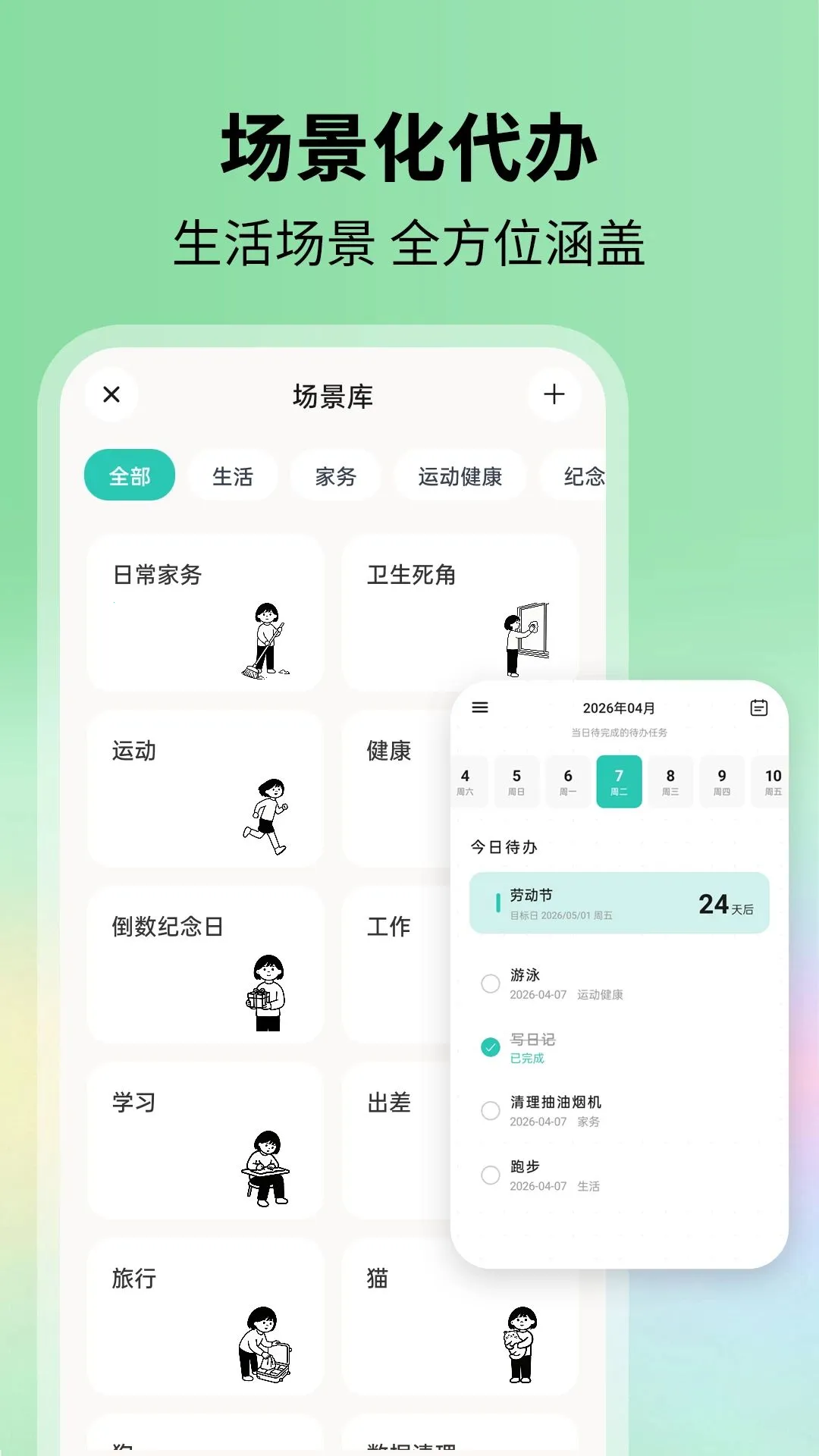 1. 场景化智能提醒贴心实用,精心设计的卡片将生活结构化,内置超全场景卡片库,一键勾选常用任务。