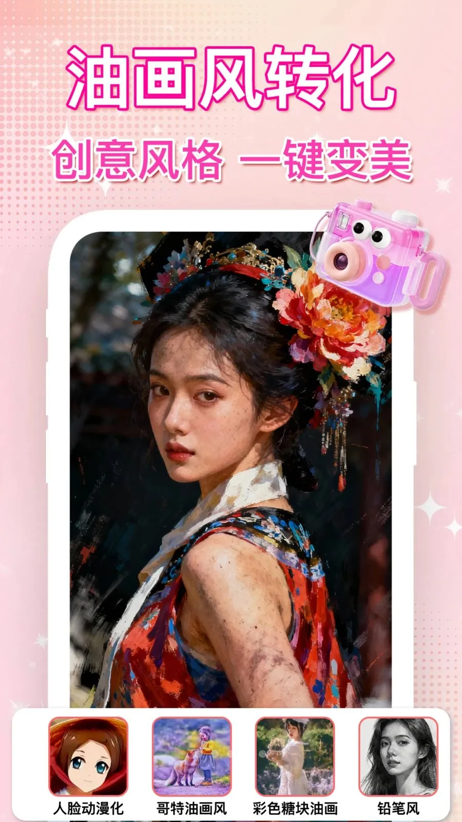 2. 风格滤镜多样,有多彩相片、人脸动漫化、油画风、铅笔风等,能随心切换,上传照片生成专属艺术大片。