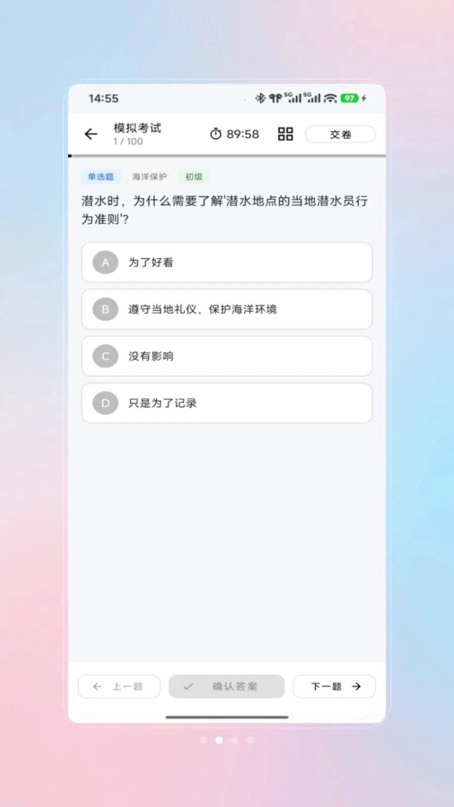 2、潜水员大夫2026最新版本的题库刷题功能十分实用。顺序练习、模拟考试以及专项训练等多种方式,能让用户全面提升潜水知识水平,更好地备考潜水证。