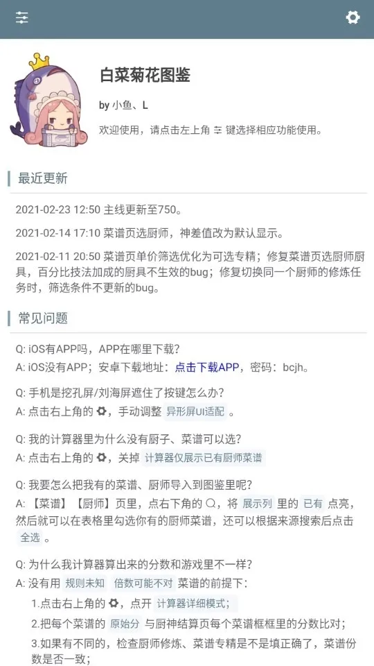 白菜菊花计算器是游戏辅助工具,有详尽图鉴系统。厨神大赛可自动匹配最佳阵容,能查贵客需求。还具备多种实用功能,如保存记录、清晰界面、图鉴管理等,另有常见问题解答。