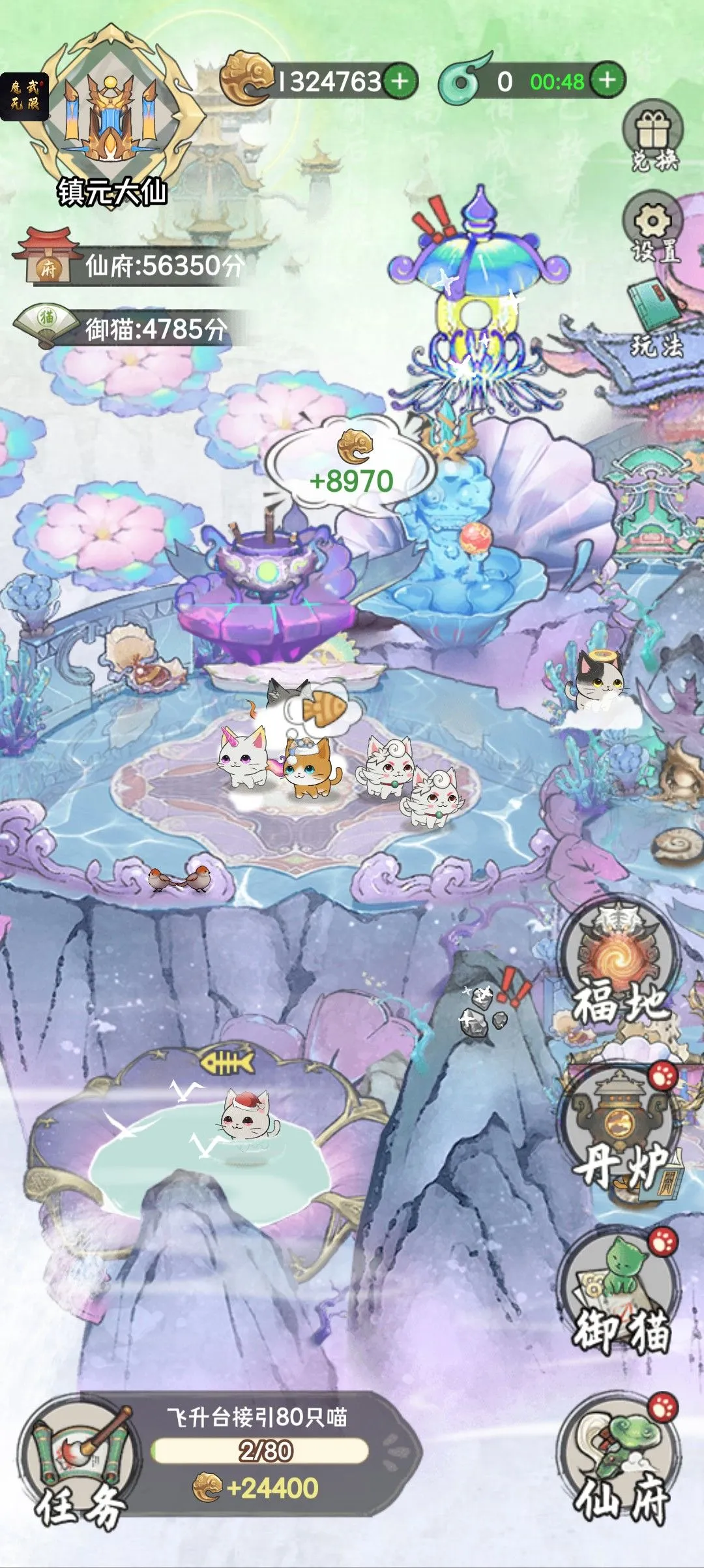 1. 它有着轻松休闲的修仙背景,玩家能畅享升官撸猫两不误的快感。在这里,玩家作为一介凡人被猫灵带进天堂,成为仙府主人,给灵池聚灵台注入灵力,开启养猫与商业模式操作,感受独特的养成体验。
