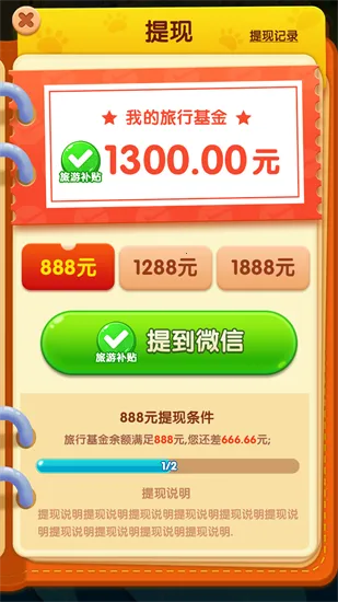 如果你想在玩游戏的同时还能赚红包,那“小狗爱旅游红包”类游戏绝对适合你!这类游戏一般是休闲益智的消除闯关玩法,操作简单易上手。玩家控制可爱的小狗踏上环游世界之旅,在不同主题的消除关卡中,从热带雨林到沙漠绿洲,从雪山冰川到古老遗址,尽情冒险。游戏画面精美,音效动听,能带来很好的视觉和听觉享受。而且关卡丰富多样,难度循序渐进,还有大量任务挑战,完成可获丰厚奖励解锁新地图。更棒的是,游戏中有新人福利,登录就能领现金红包,红包当天到账还能反复提现。在这里,你不仅能享受消除游戏的乐趣,还能通过完成任务赚取积分兑换红包,在轻松愉悦的氛围中体验不一样的旅游风情,随时随地打开游戏就能消磨闲暇时光,快来试试吧!