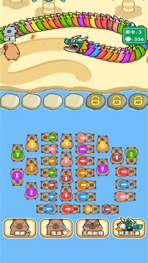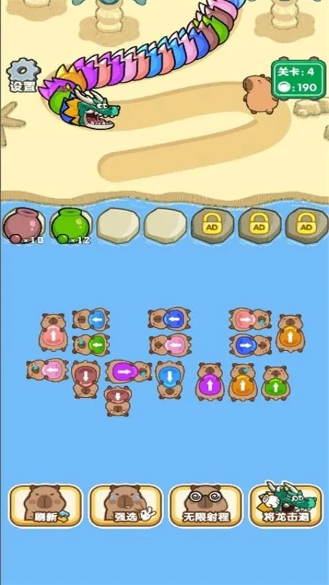 2. 道具助力,通关轻松:游戏支持多种辅助道具。能选无限射程道具,让大炮攻击更多地方;恶龙靠近可击退;还有水豚强选道具,能强制选大炮攻击恶龙;能刷新水豚大炮,快速找到合适的。这些道具让游戏更具策略性,通关变得轻松。