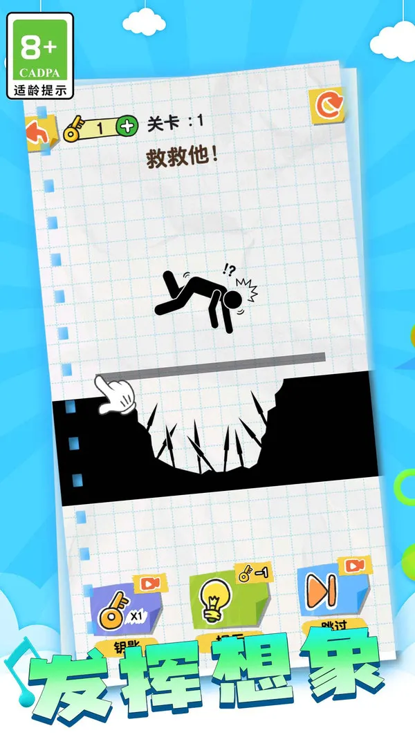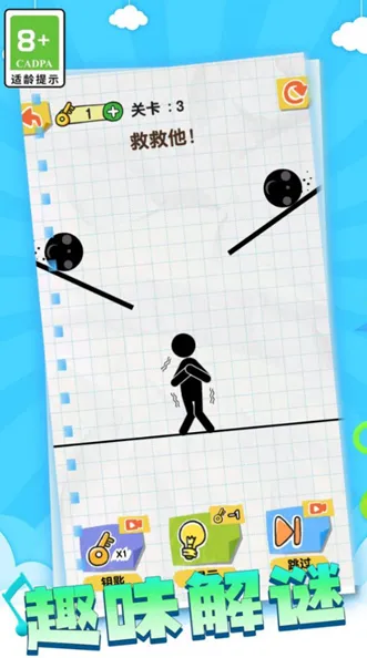 1. 它的玩法独特,玩家要扮演握画笔的火柴人,通过画出线条引导其前进,克服重重障碍到达目的地。比如在关卡场景中划线保护火柴人安全,且只能画一笔,每个关卡难点不同,需先观察场景和危险物品布局。