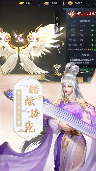 2. **精美画面**:游戏画面设计精美,对战打击感真实,人物宠物坐骑羽翼法宝神兵等多种精美外观可选择并培养,属性和外形一手掌握,为玩家带来视觉盛宴。